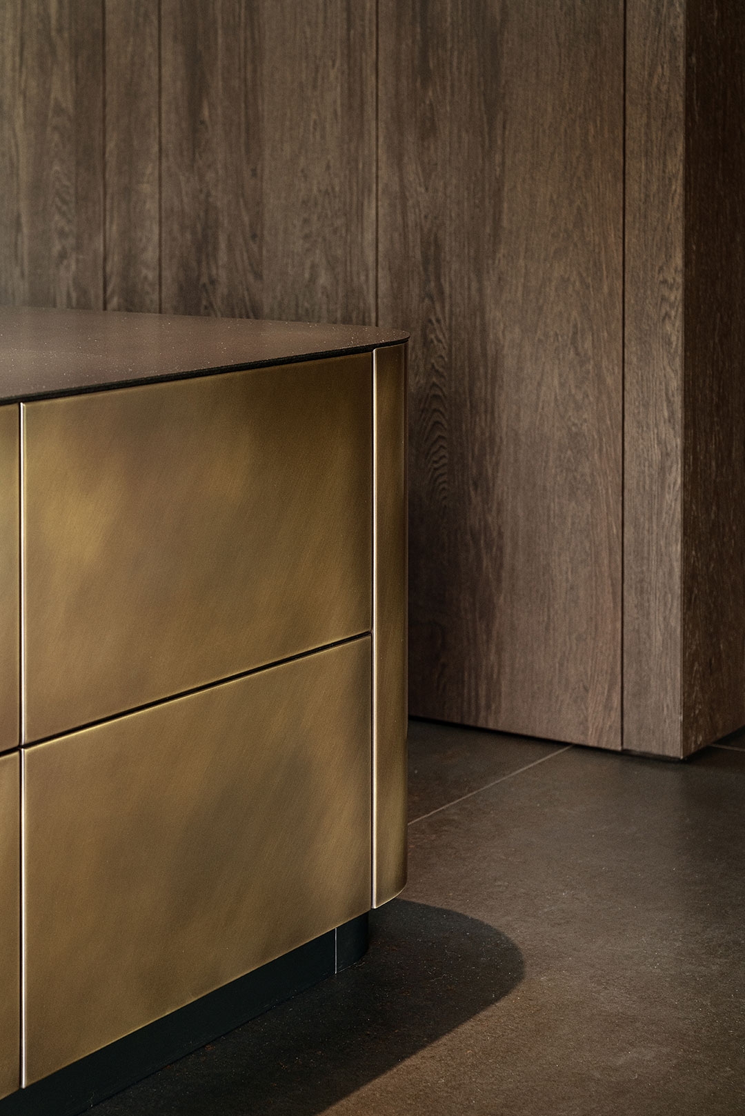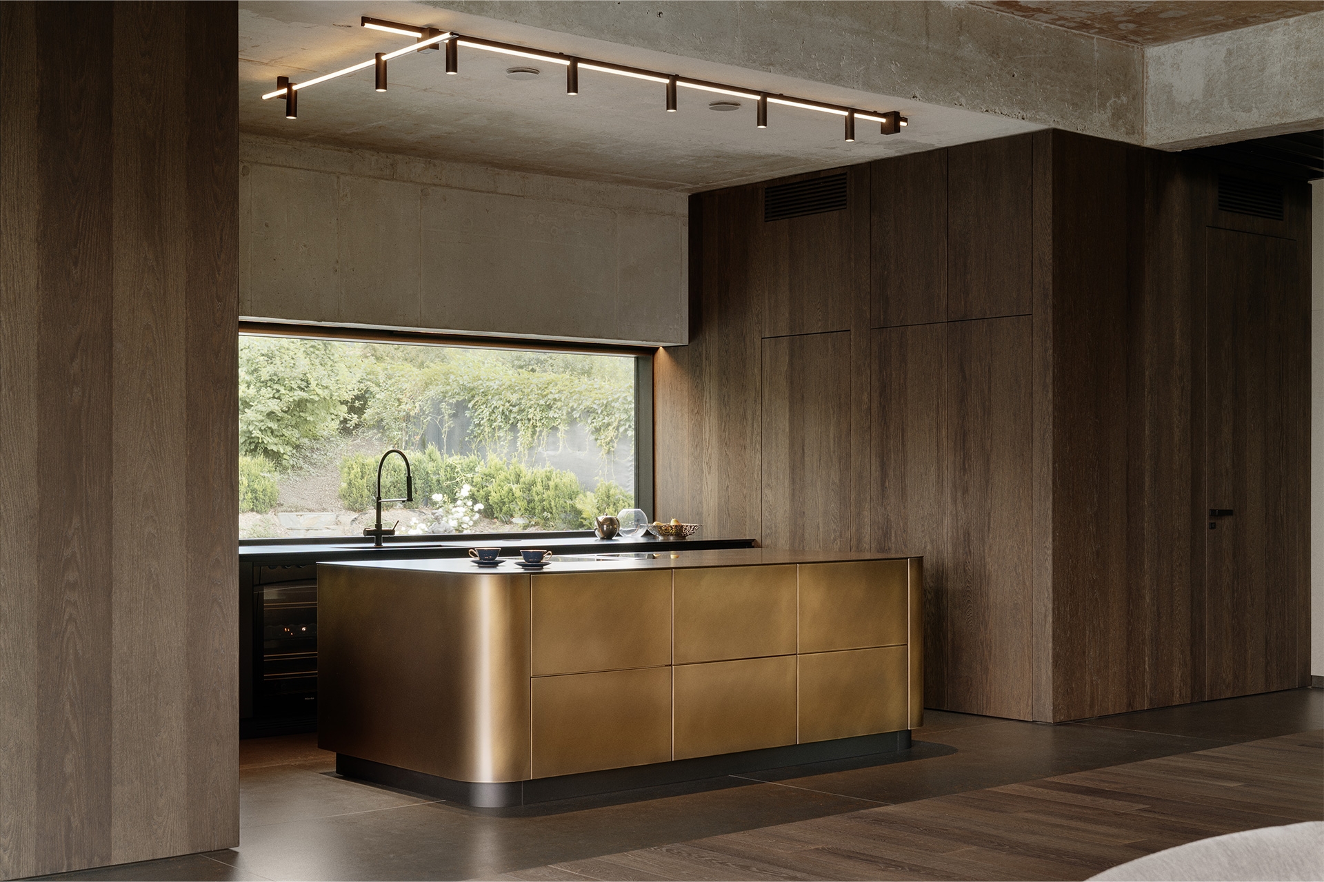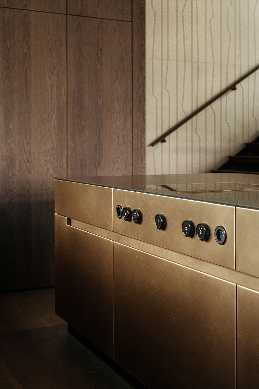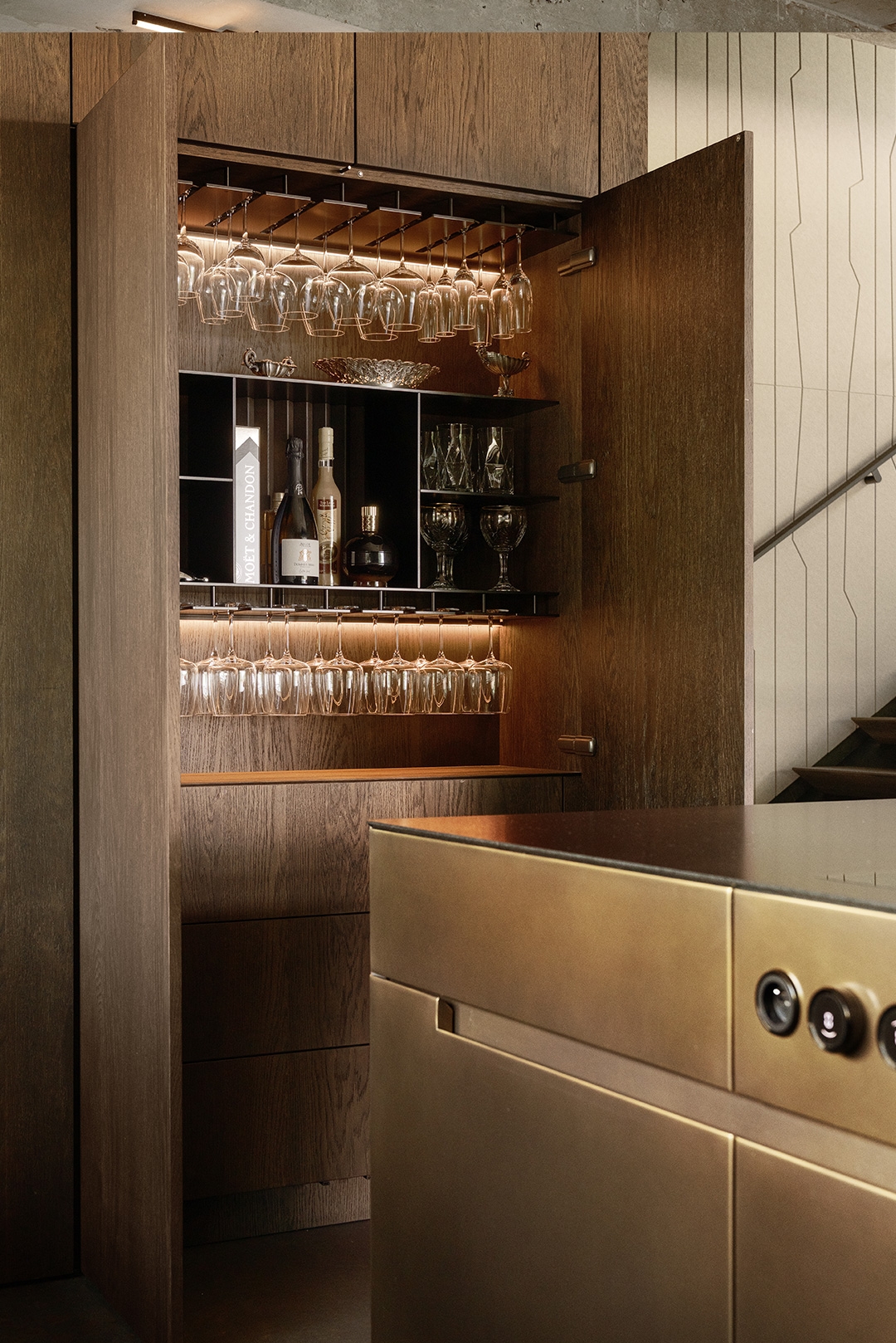 The main kitchen seamlessly combines brass with stained oak veneer. A second kitchen and a wine cellar have been created in the home spa area. The bar module is hidden in the tall cabinets of the main kitchen.