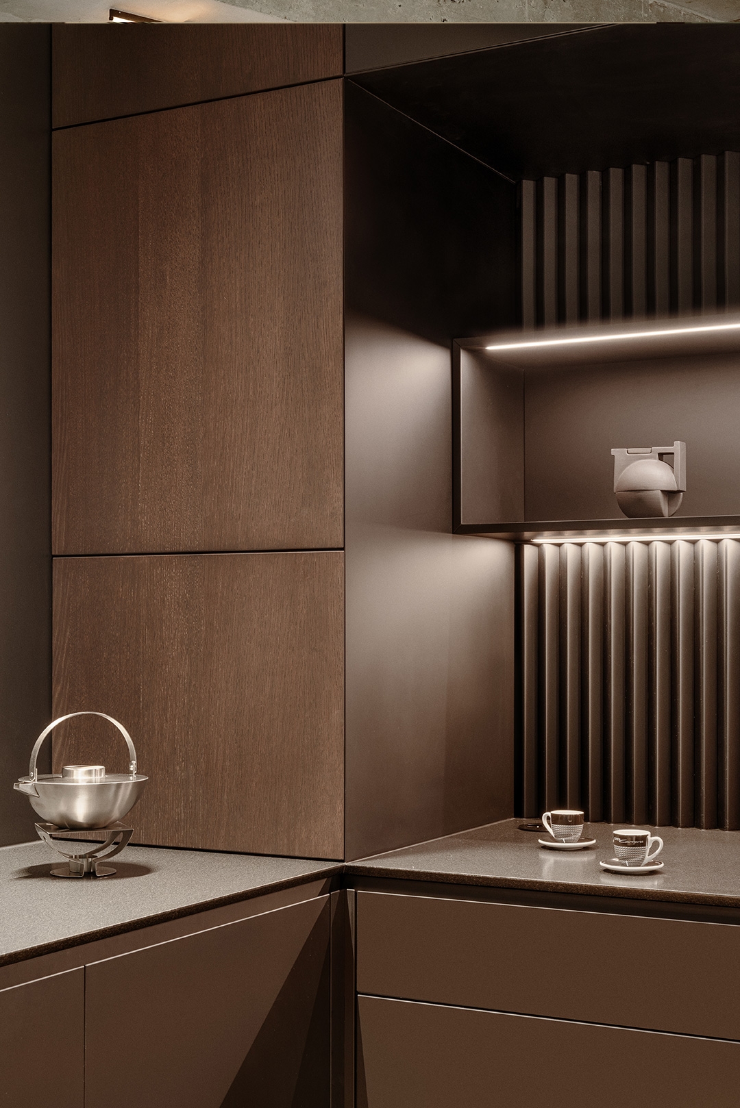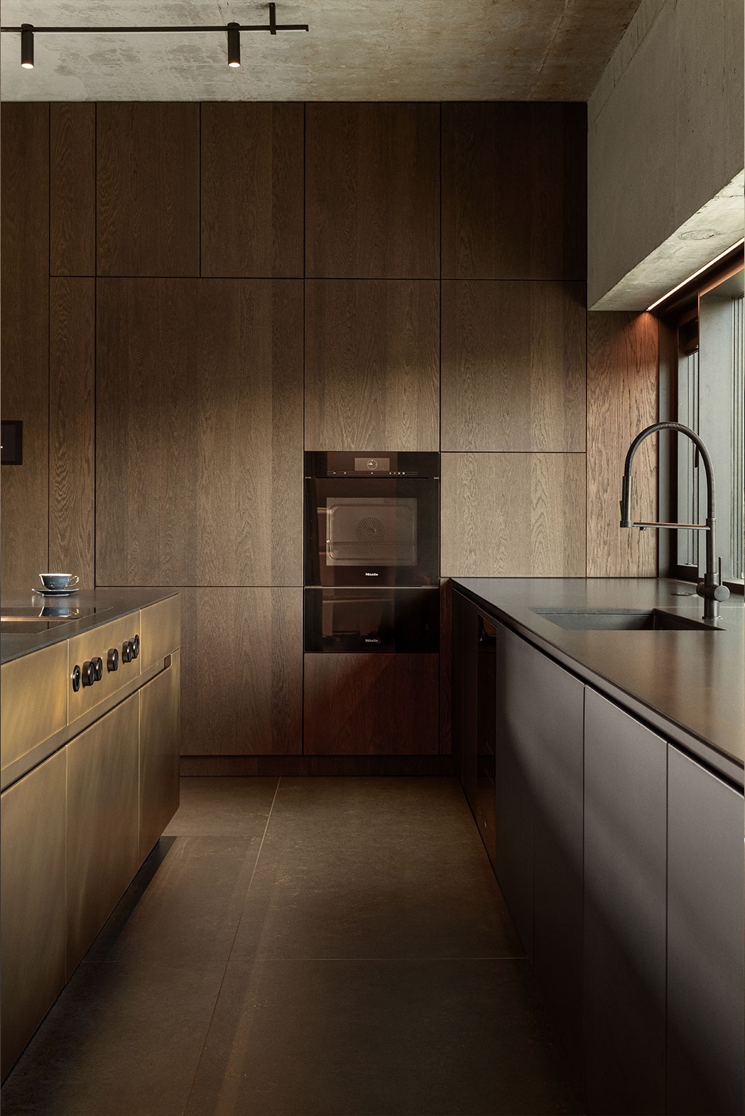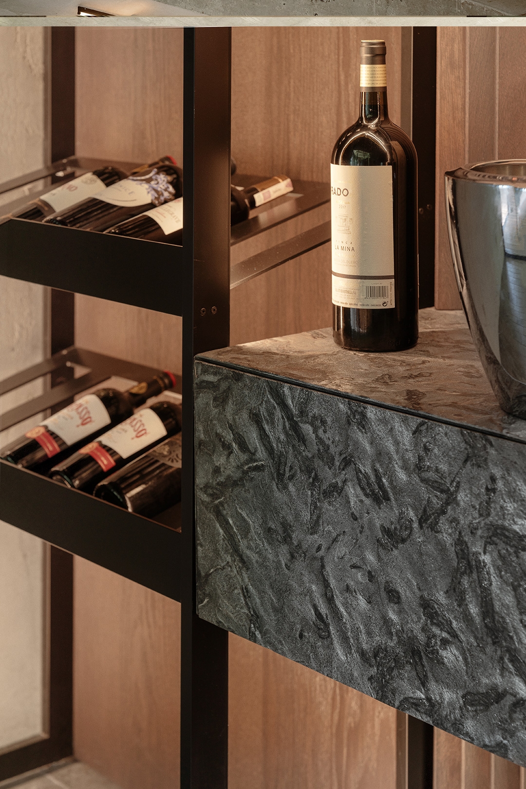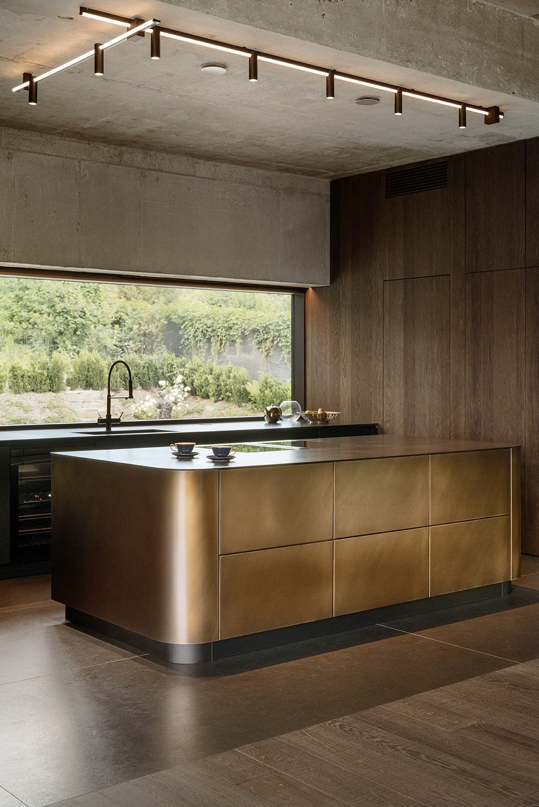 The main kitchen seamlessly combines brass with stained oak veneer. A second kitchen and a wine cellar have been created in the home spa area. The bar module is hidden in the tall cabinets of the main kitchen.