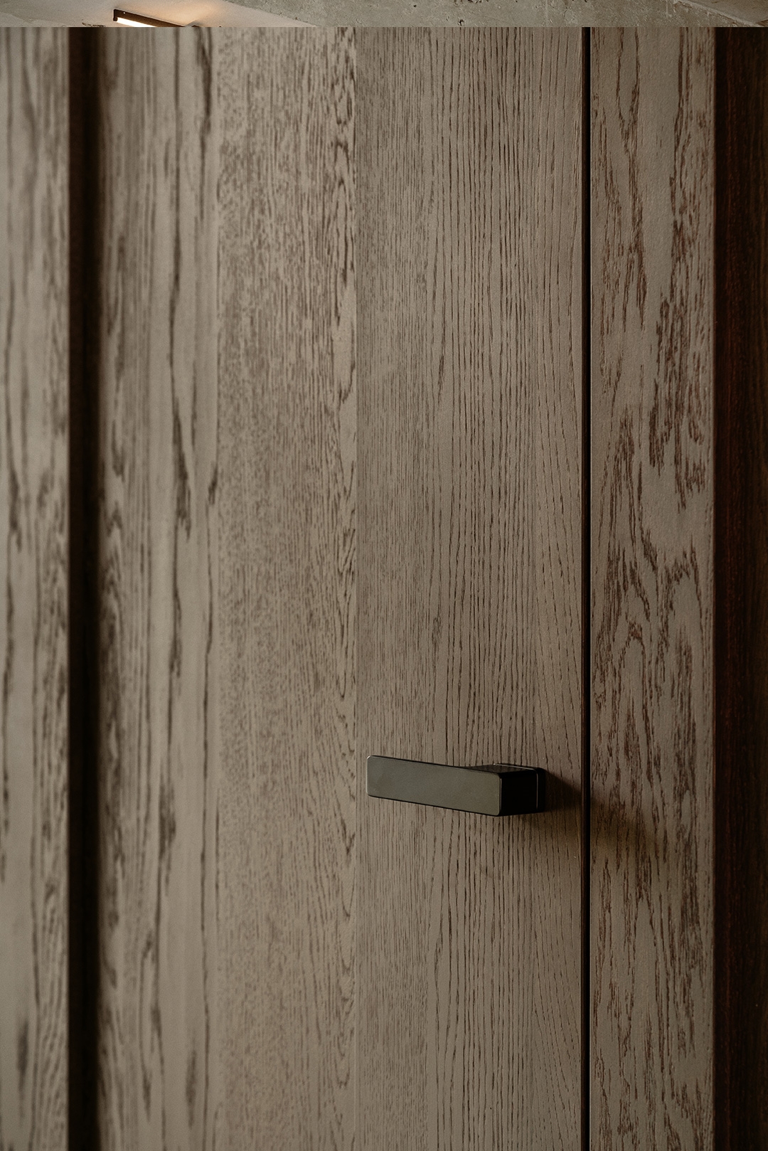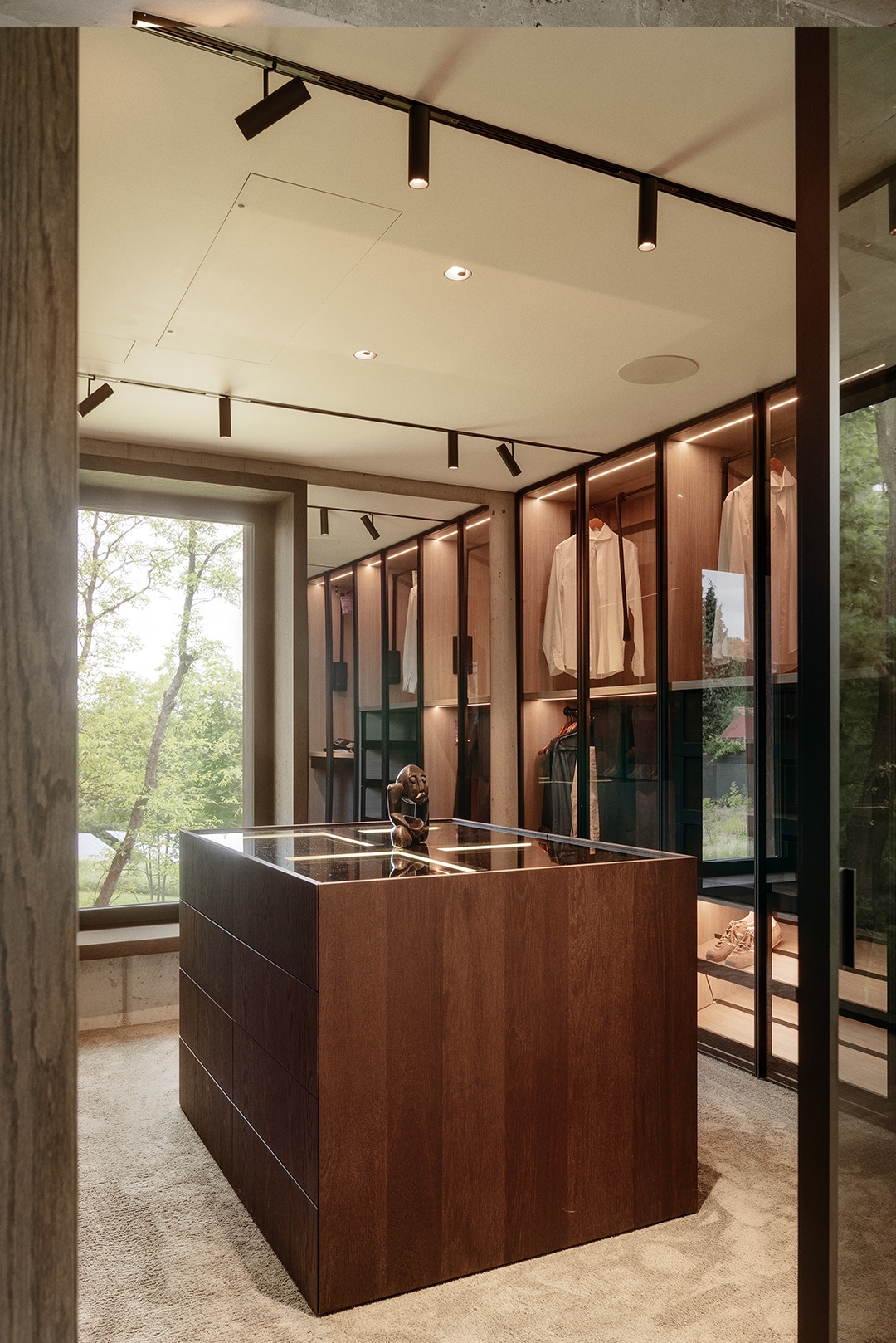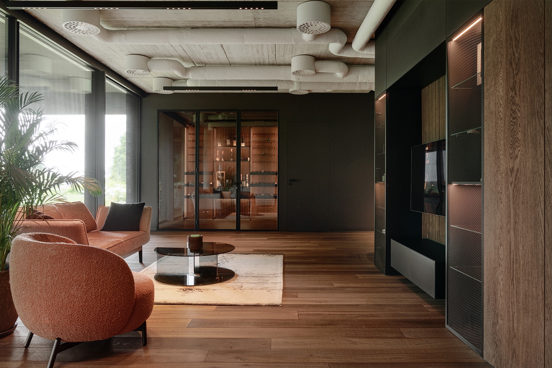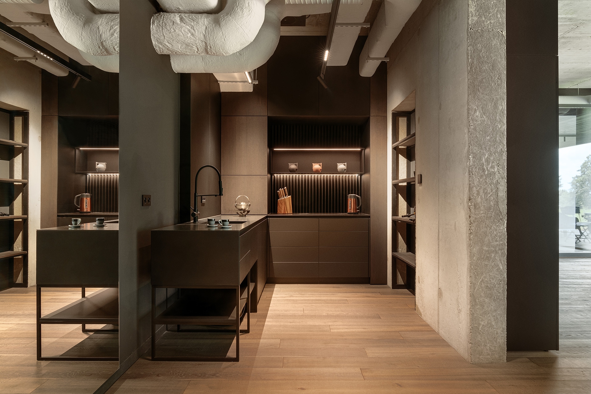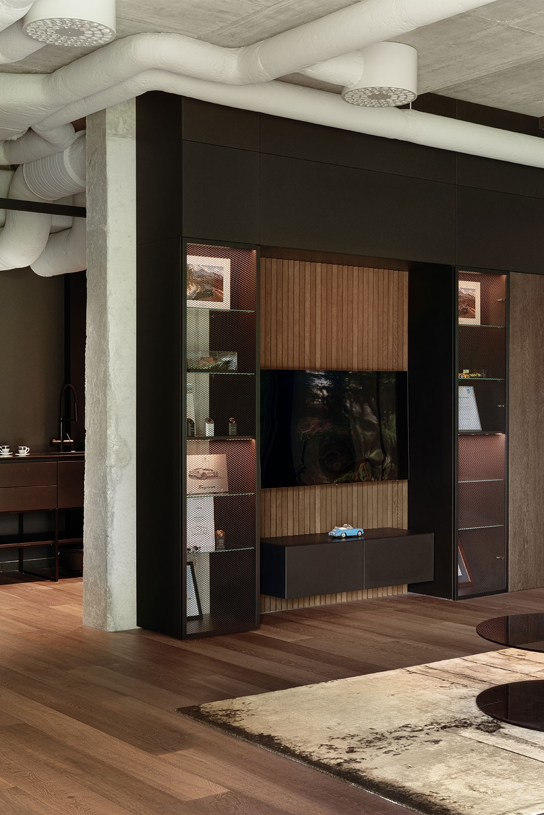 The main kitchen seamlessly combines brass with stained oak veneer. A second kitchen and a wine cellar have been created in the home spa area. The bar module is hidden in the tall cabinets of the main kitchen.