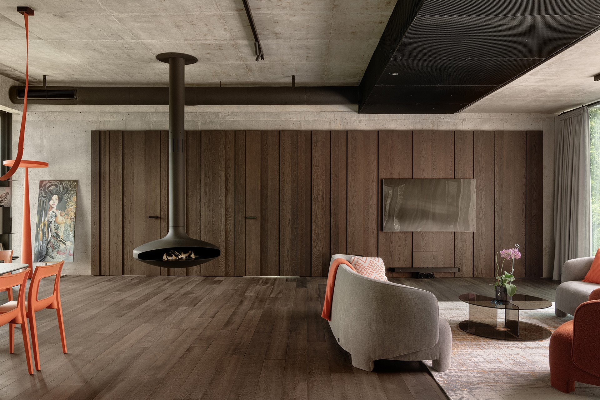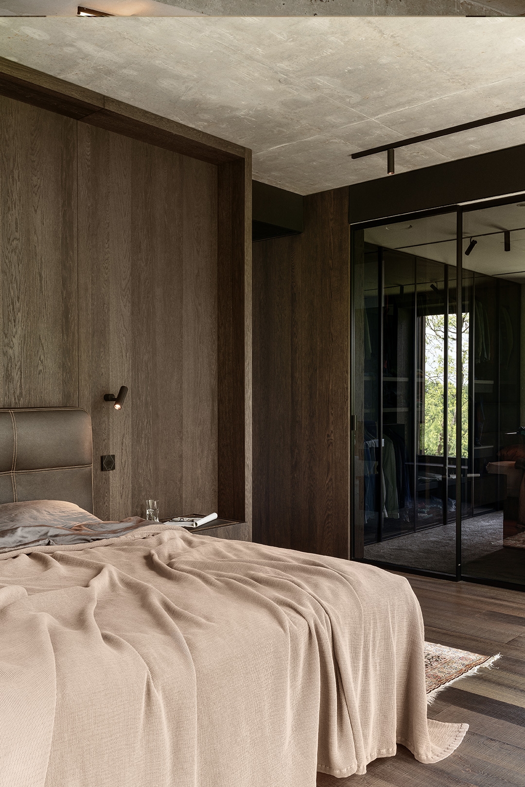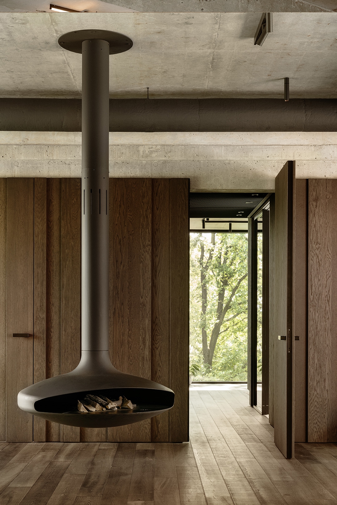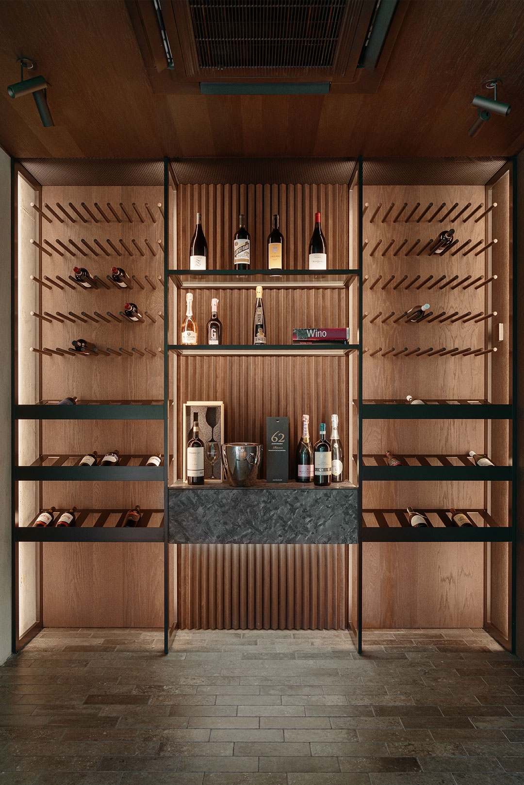 The main kitchen seamlessly combines brass with stained oak veneer. A second kitchen and a wine cellar have been created in the home spa area. The bar module is hidden in the tall cabinets of the main kitchen.