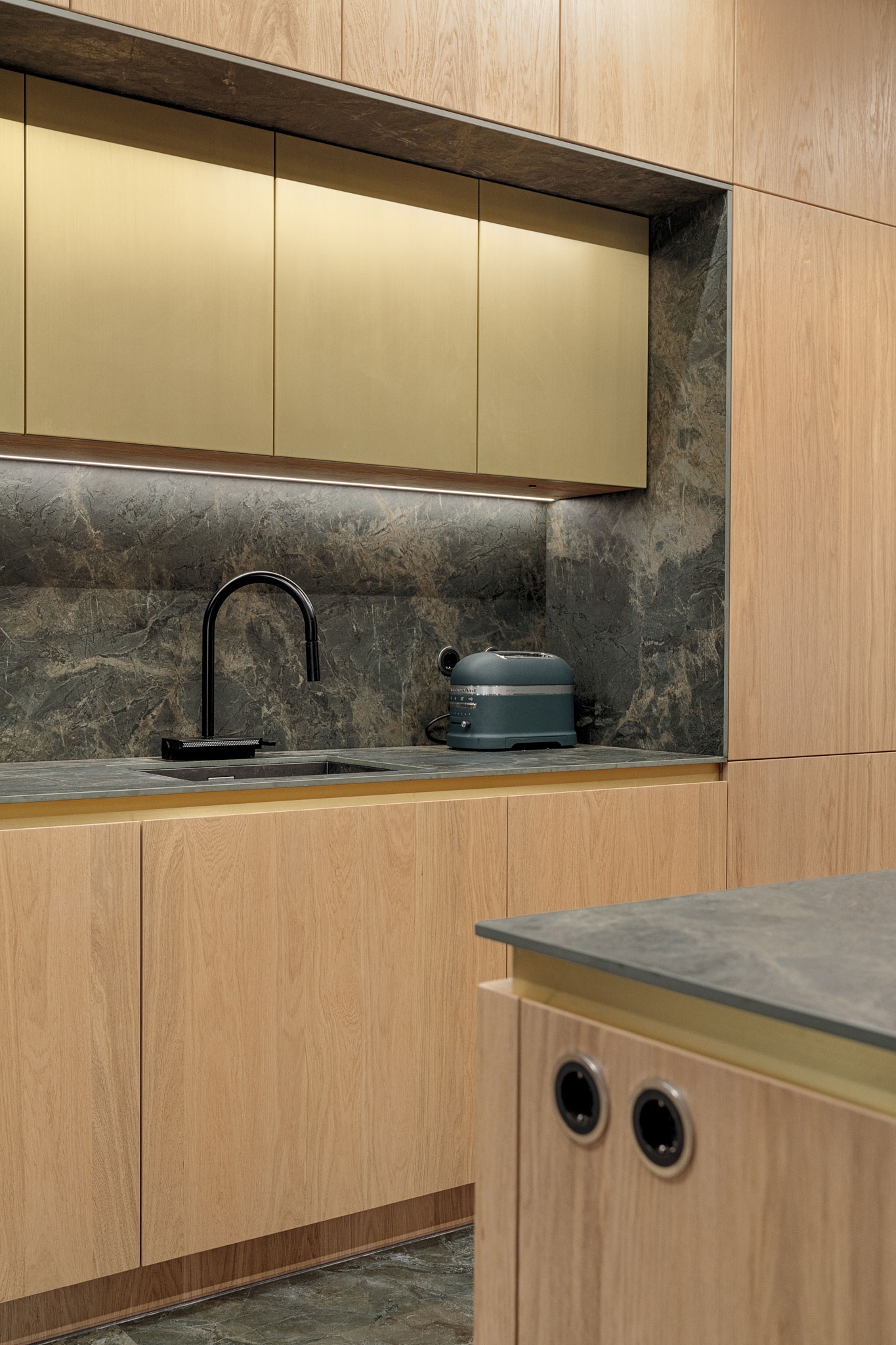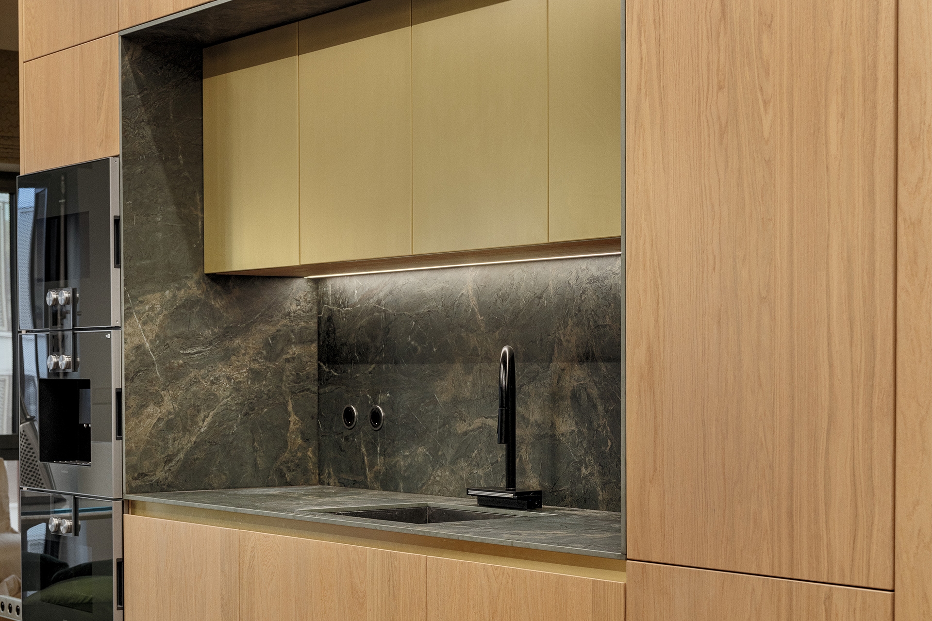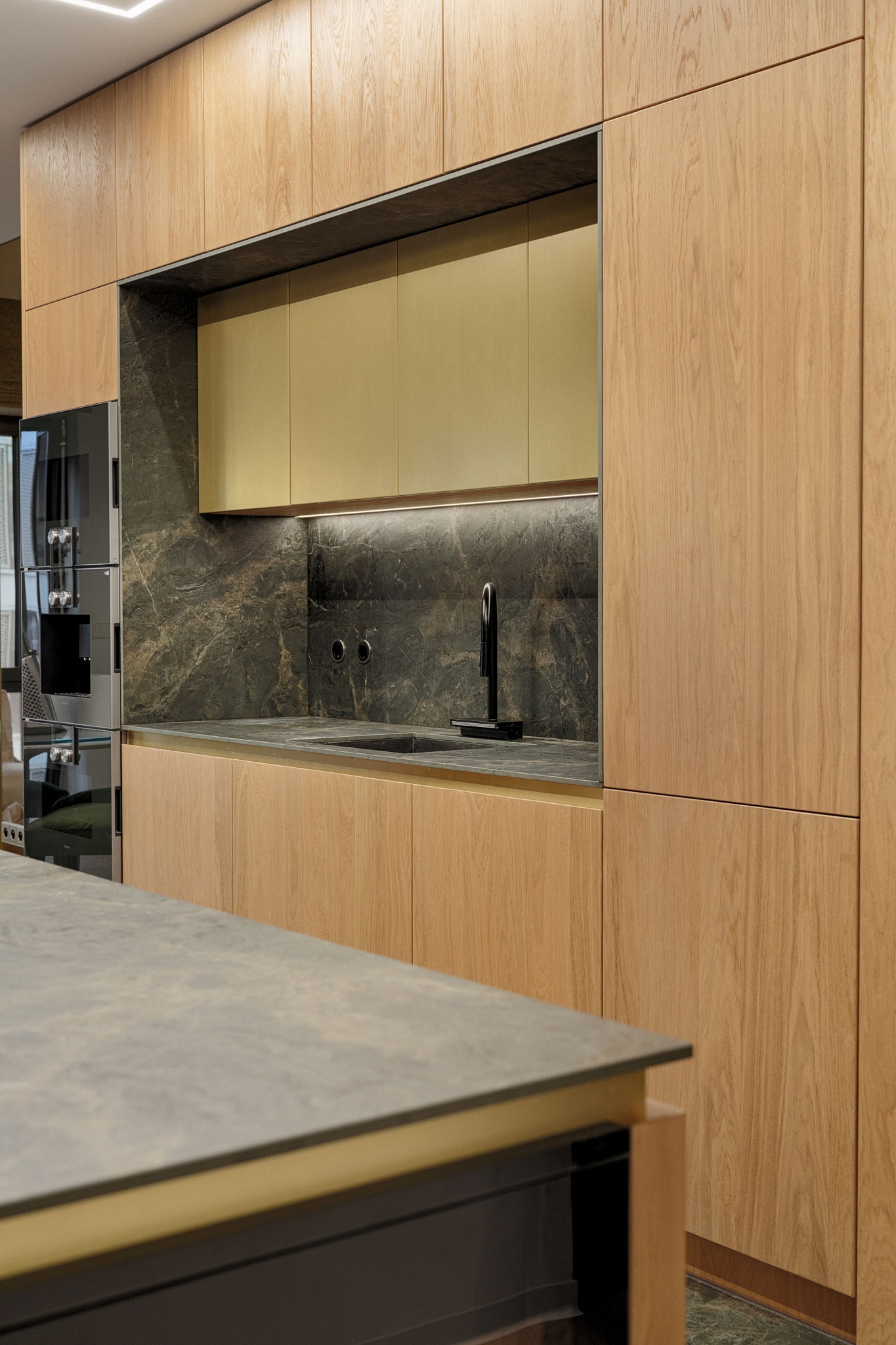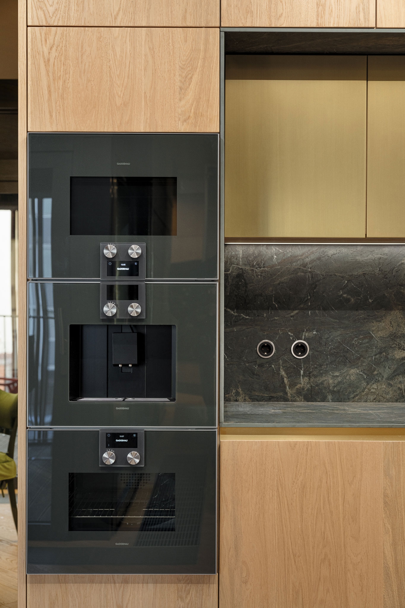 The kitchen is part of the open-plan living area in this metropolitan apartment. It features the same finishes consistently used throughout the interior, creating a coherent and refined aesthetic. Natural oak veneer covers the kitchen fronts, while copper accents are subtly embedded in the recessed spaces between the wooden fronts and the sintered stone countertop. The kitchen is visually separated from the living area by an island, which connects to a tall, sculptural unit that includes a copper openwork shelf, a glass-fronted cabinet, and a sintered stone-clad module. The layout ensures high ergonomic comfort, complemented by a wide range of premium appliances from Gaggenau.