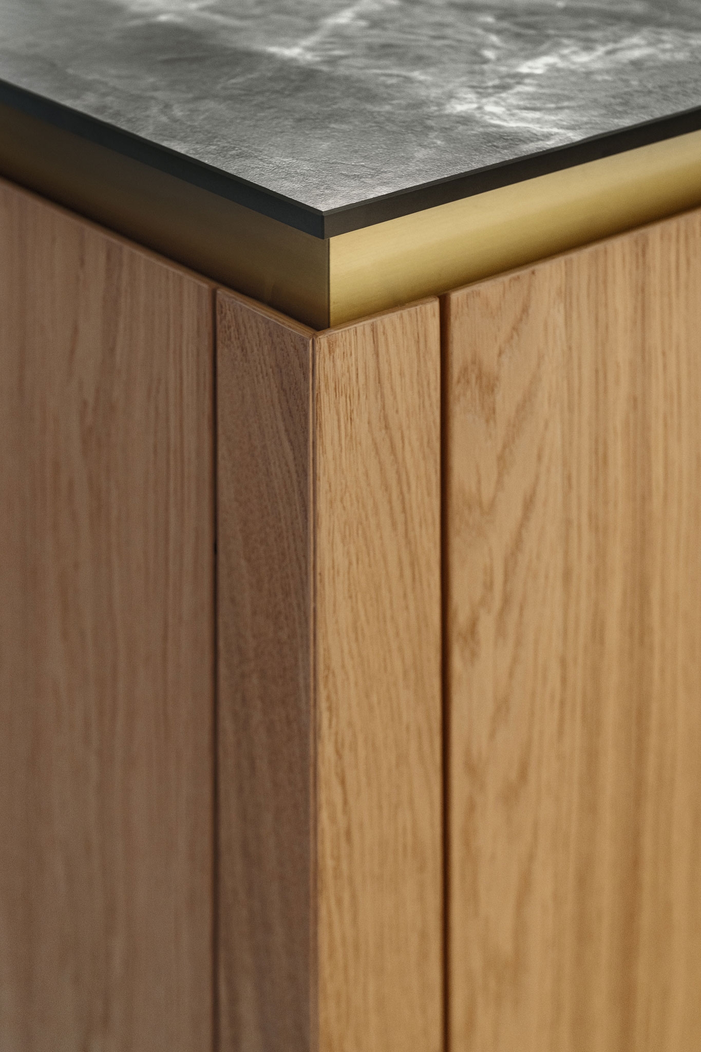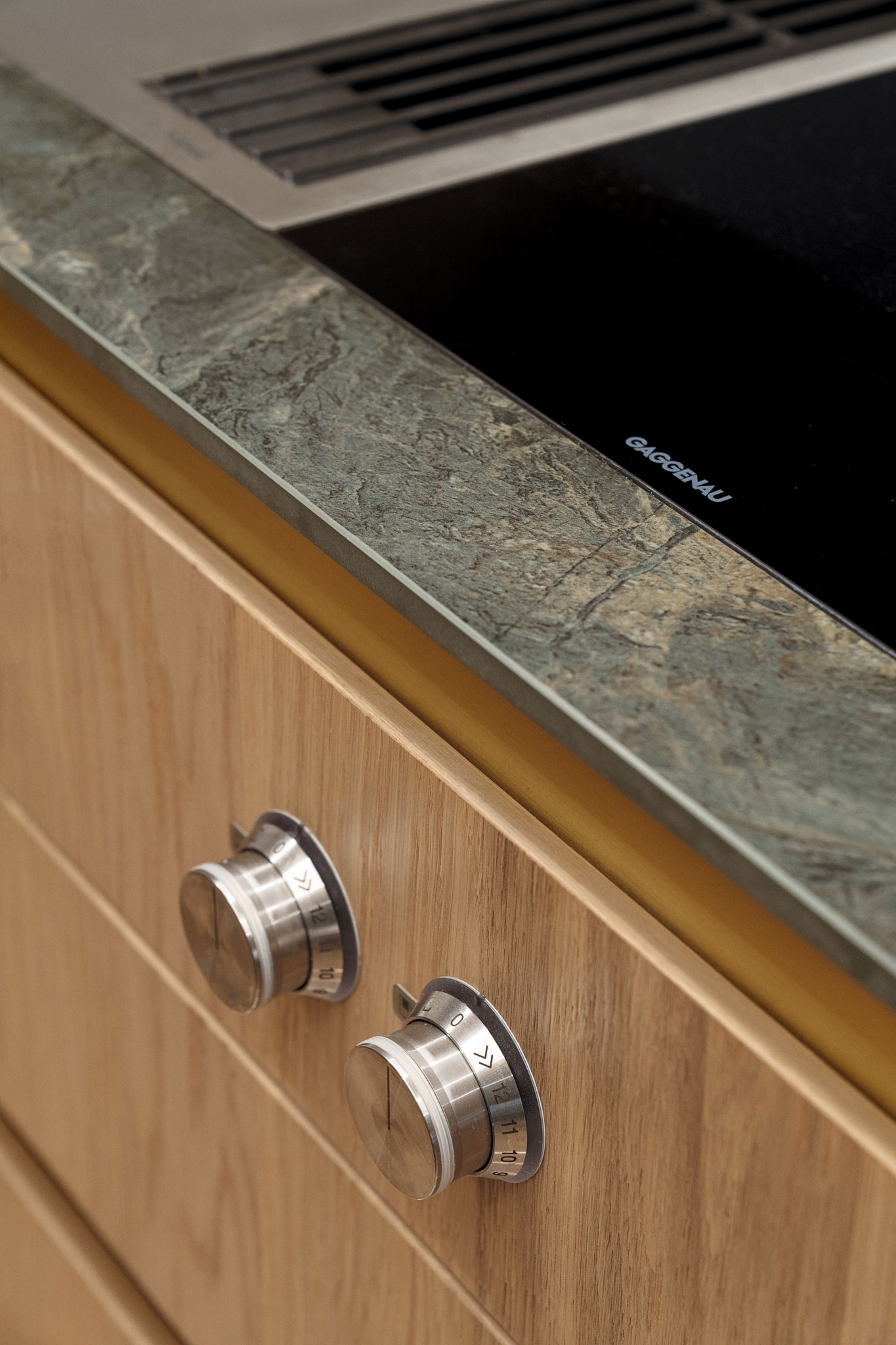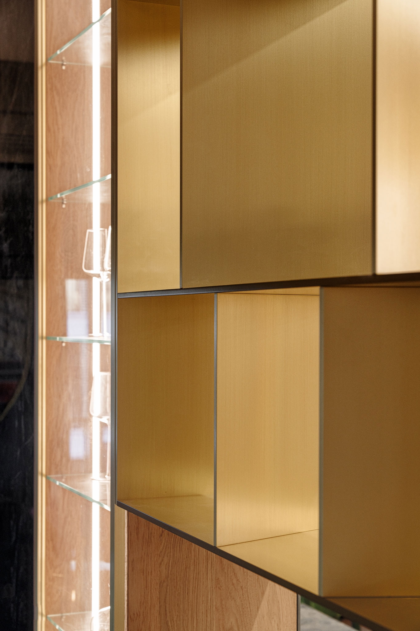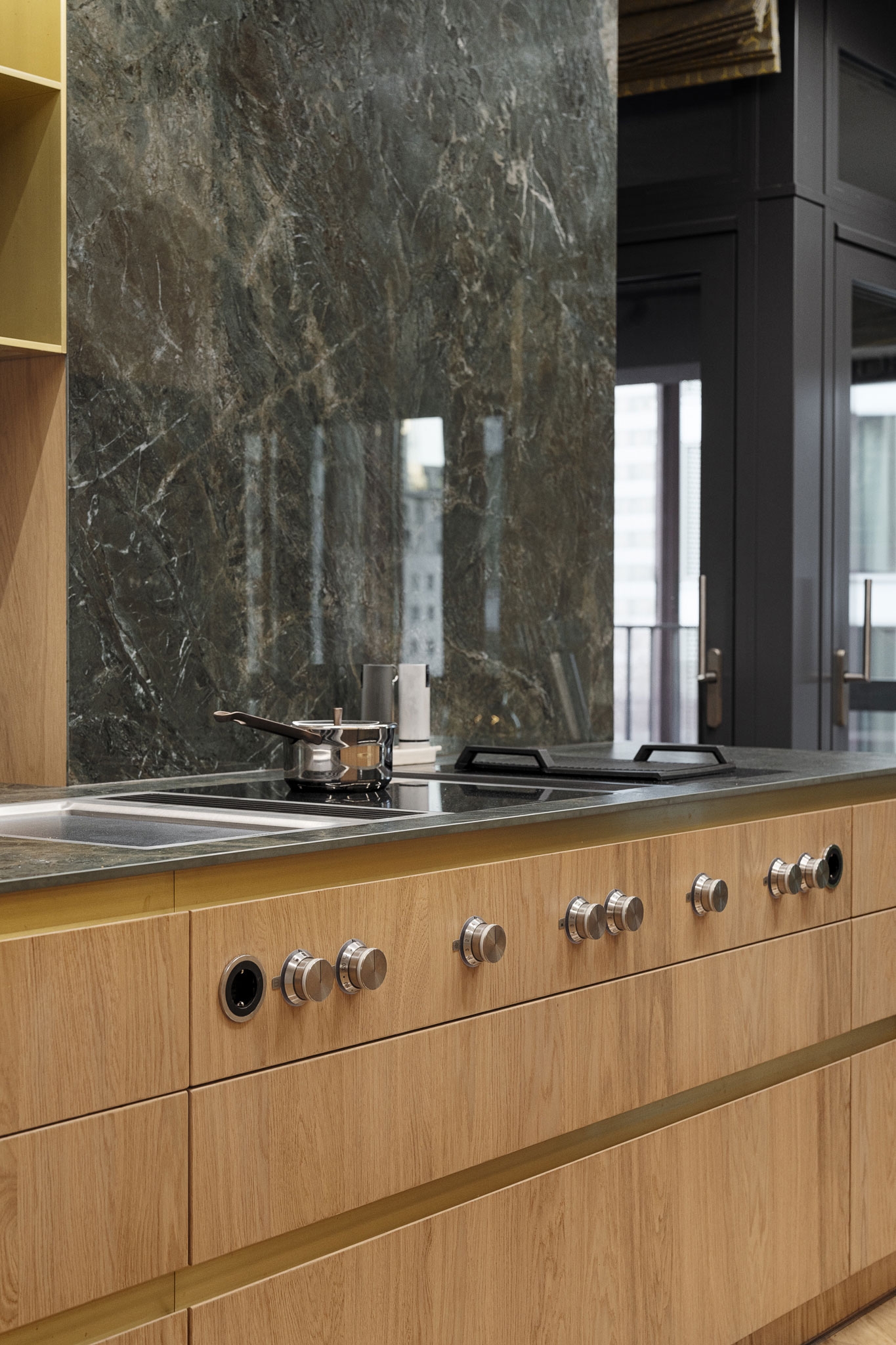 The kitchen is part of the open-plan living area in this metropolitan apartment. It features the same finishes consistently used throughout the interior, creating a coherent and refined aesthetic. Natural oak veneer covers the kitchen fronts, while copper accents are subtly embedded in the recessed spaces between the wooden fronts and the sintered stone countertop. The kitchen is visually separated from the living area by an island, which connects to a tall, sculptural unit that includes a copper openwork shelf, a glass-fronted cabinet, and a sintered stone-clad module. The layout ensures high ergonomic comfort, complemented by a wide range of premium appliances from Gaggenau.