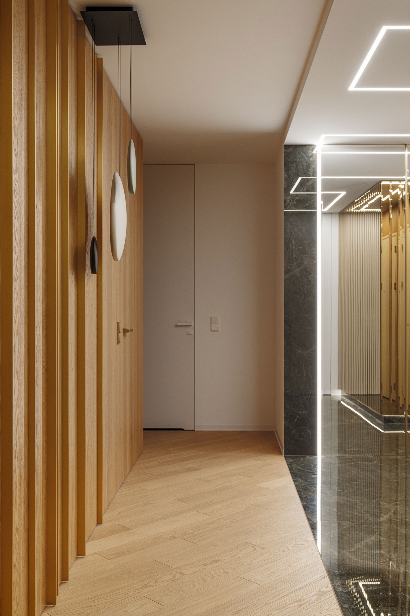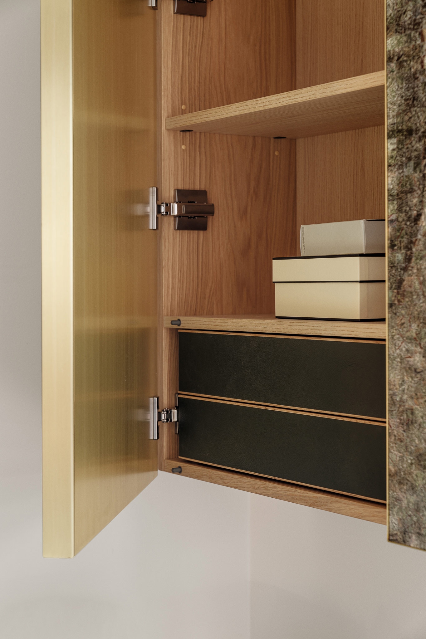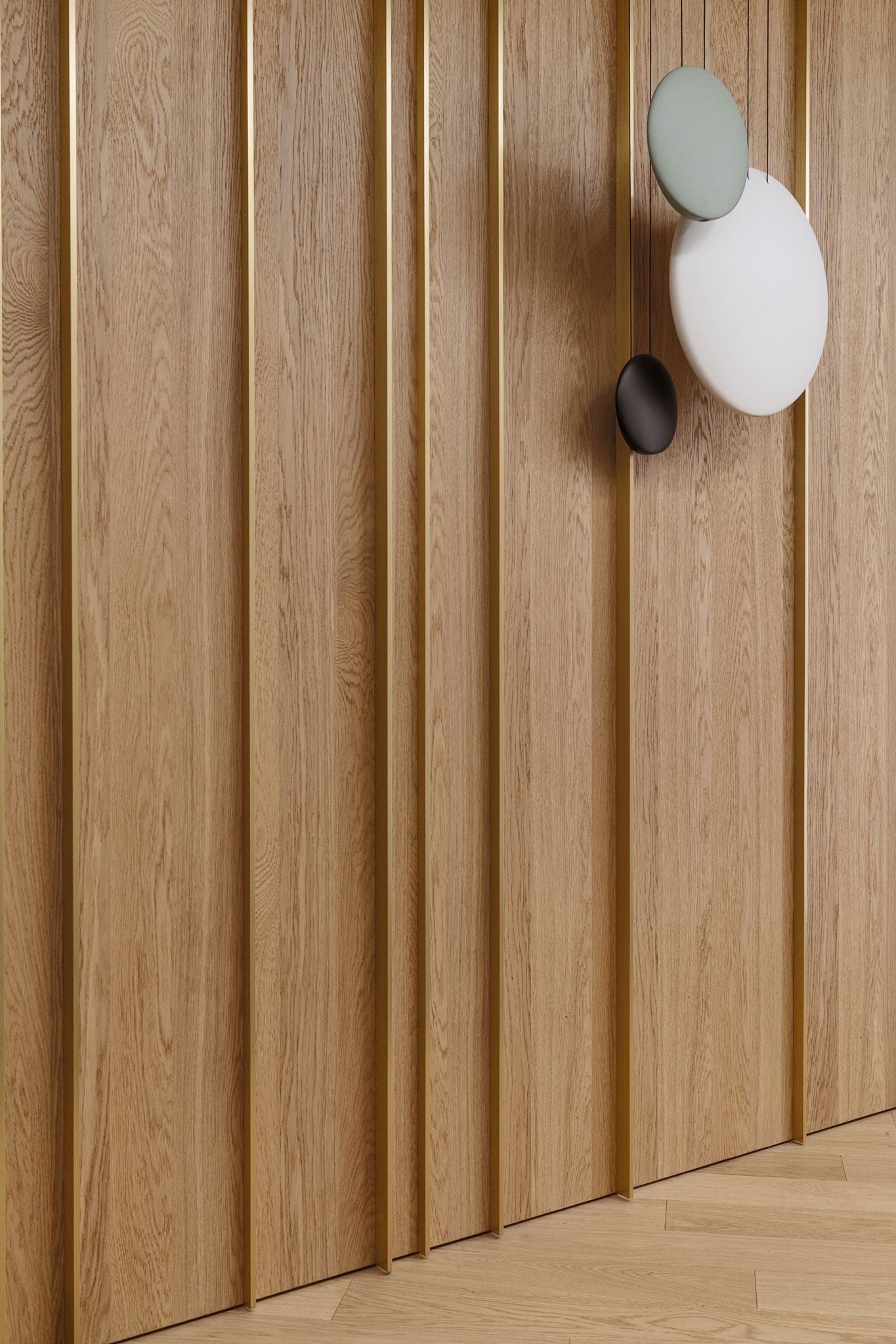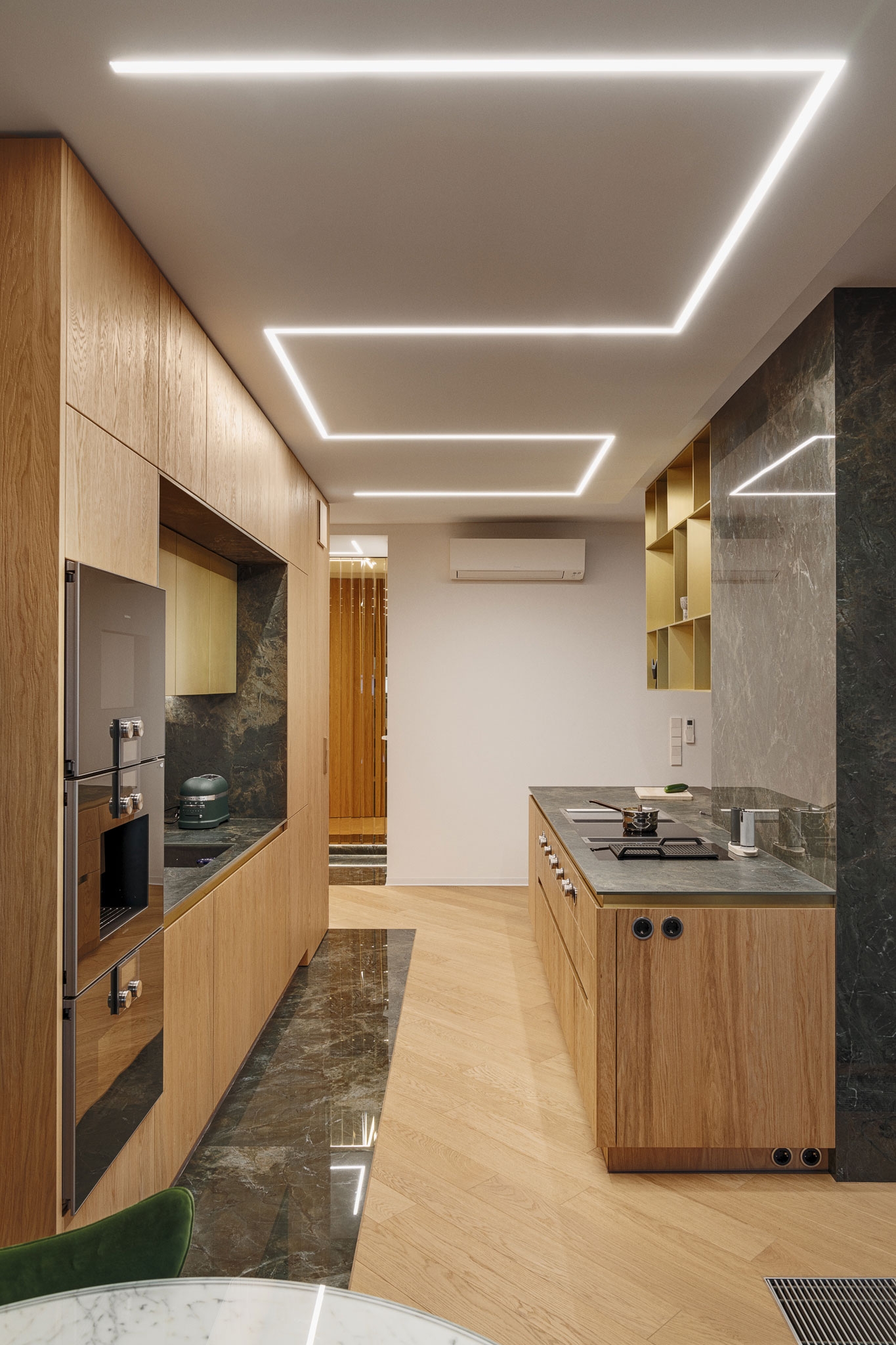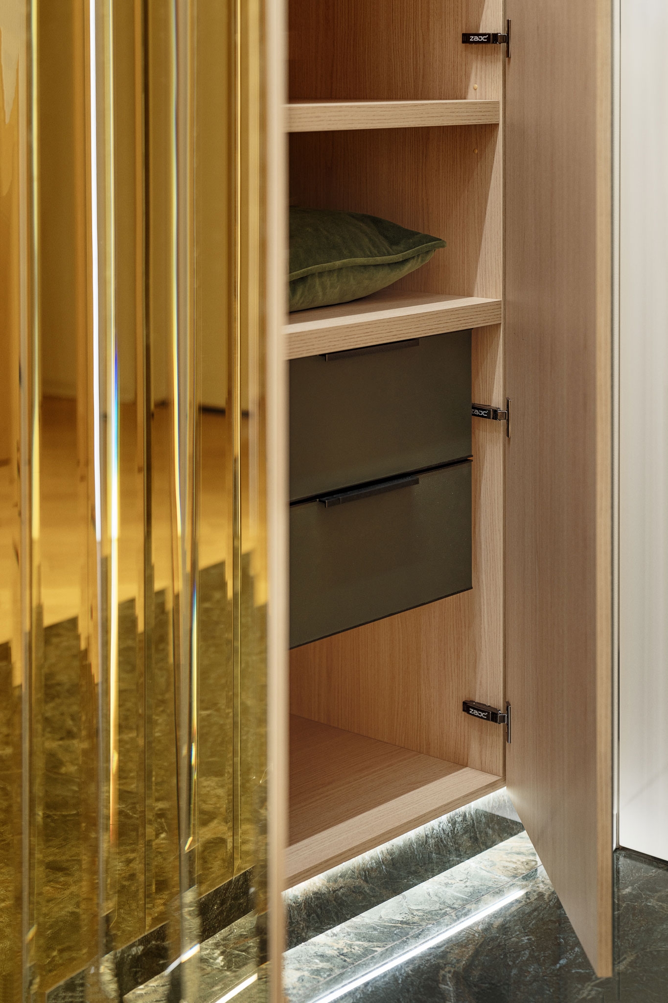 The kitchen is part of the open-plan living area in this metropolitan apartment. It features the same finishes consistently used throughout the interior, creating a coherent and refined aesthetic. Natural oak veneer covers the kitchen fronts, while copper accents are subtly embedded in the recessed spaces between the wooden fronts and the sintered stone countertop. The kitchen is visually separated from the living area by an island, which connects to a tall, sculptural unit that includes a copper openwork shelf, a glass-fronted cabinet, and a sintered stone-clad module. The layout ensures high ergonomic comfort, complemented by a wide range of premium appliances from Gaggenau.