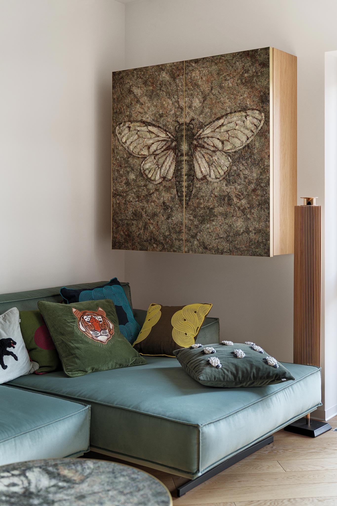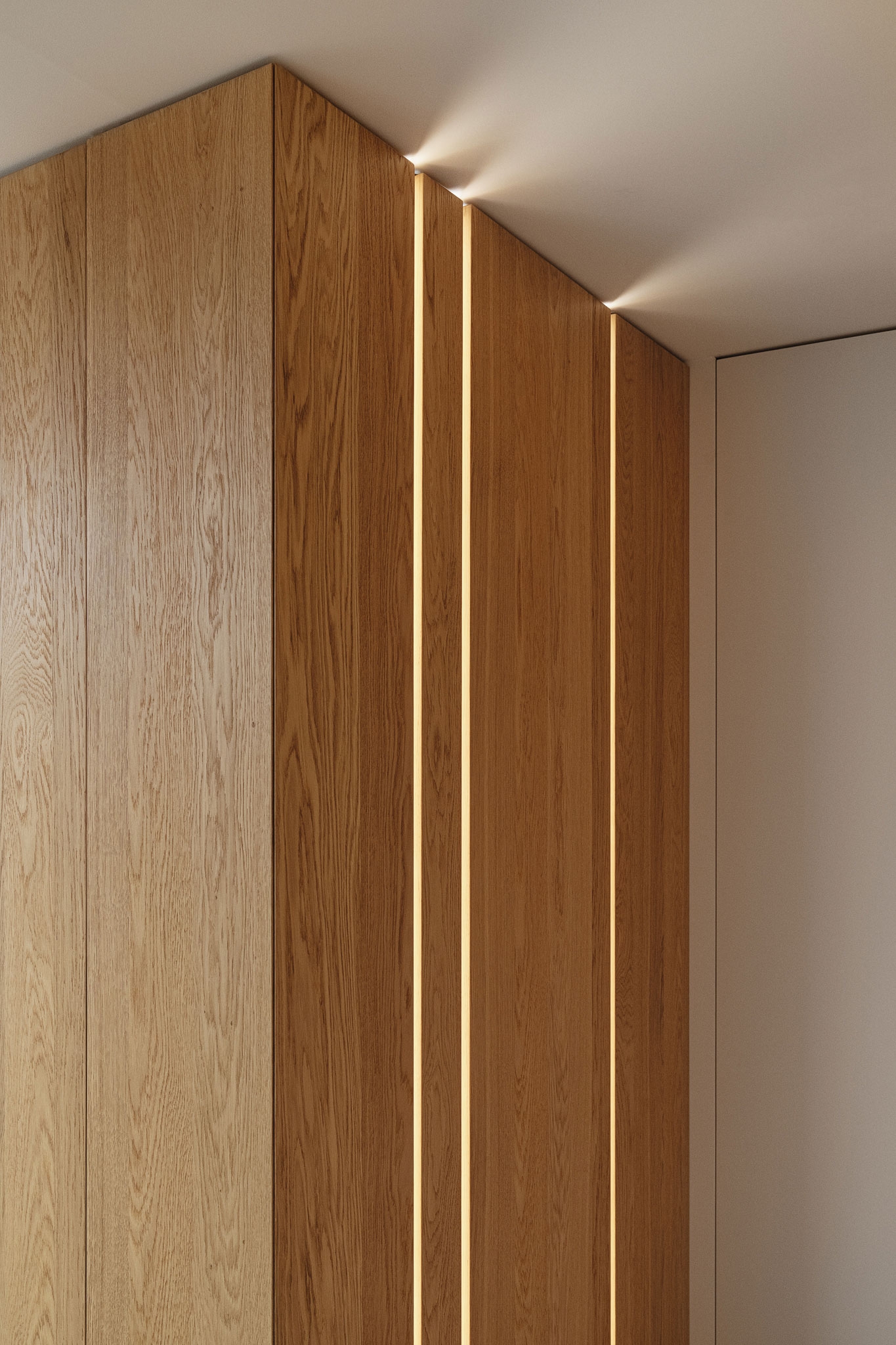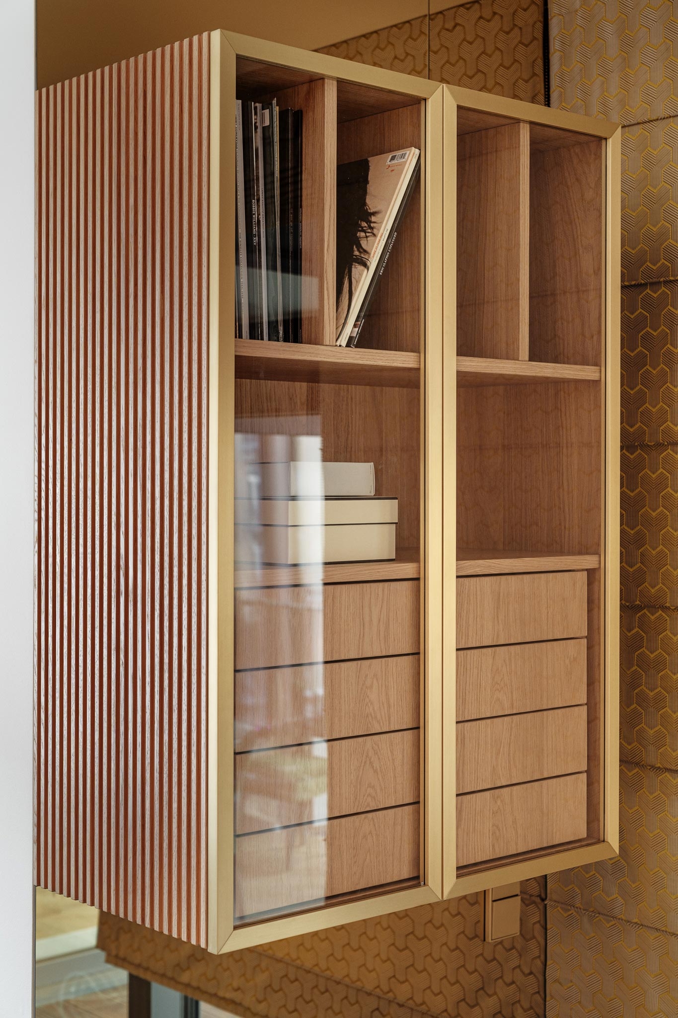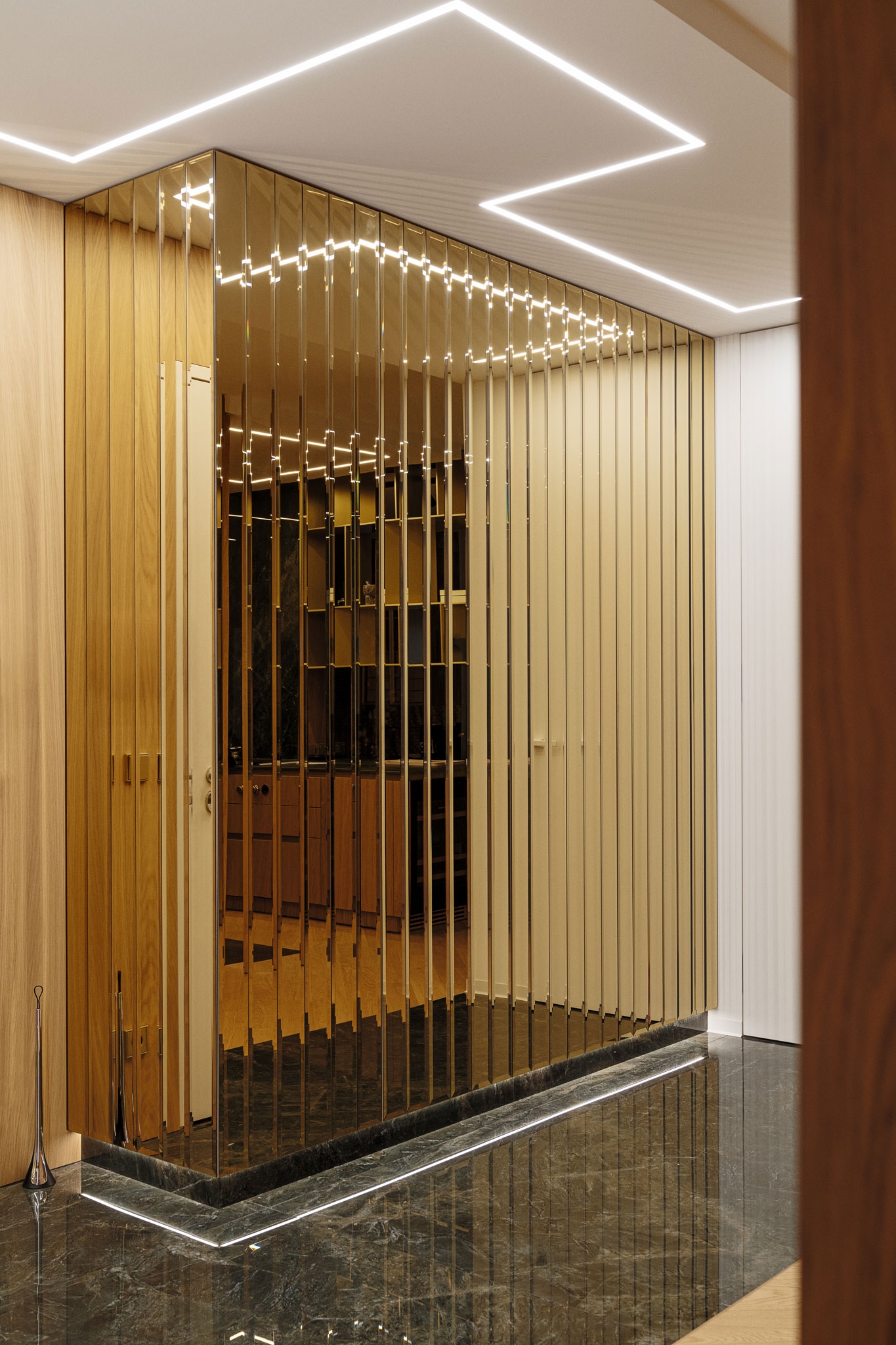 The kitchen is part of the open-plan living area in this metropolitan apartment. It features the same finishes consistently used throughout the interior, creating a coherent and refined aesthetic. Natural oak veneer covers the kitchen fronts, while copper accents are subtly embedded in the recessed spaces between the wooden fronts and the sintered stone countertop. The kitchen is visually separated from the living area by an island, which connects to a tall, sculptural unit that includes a copper openwork shelf, a glass-fronted cabinet, and a sintered stone-clad module. The layout ensures high ergonomic comfort, complemented by a wide range of premium appliances from Gaggenau.