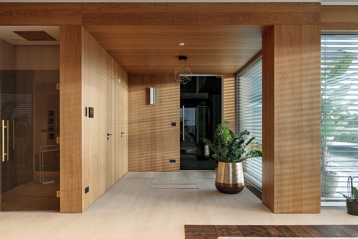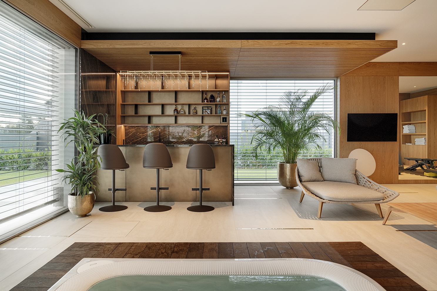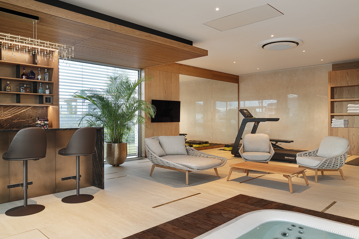 W rezydencji znajduje się również strefa wellness, zaprojektowana z myślą o zdrowiu i regeneracji. Sauny, przestrzeń do ćwiczeń oraz bar tworzą spójną, kameralną całość.