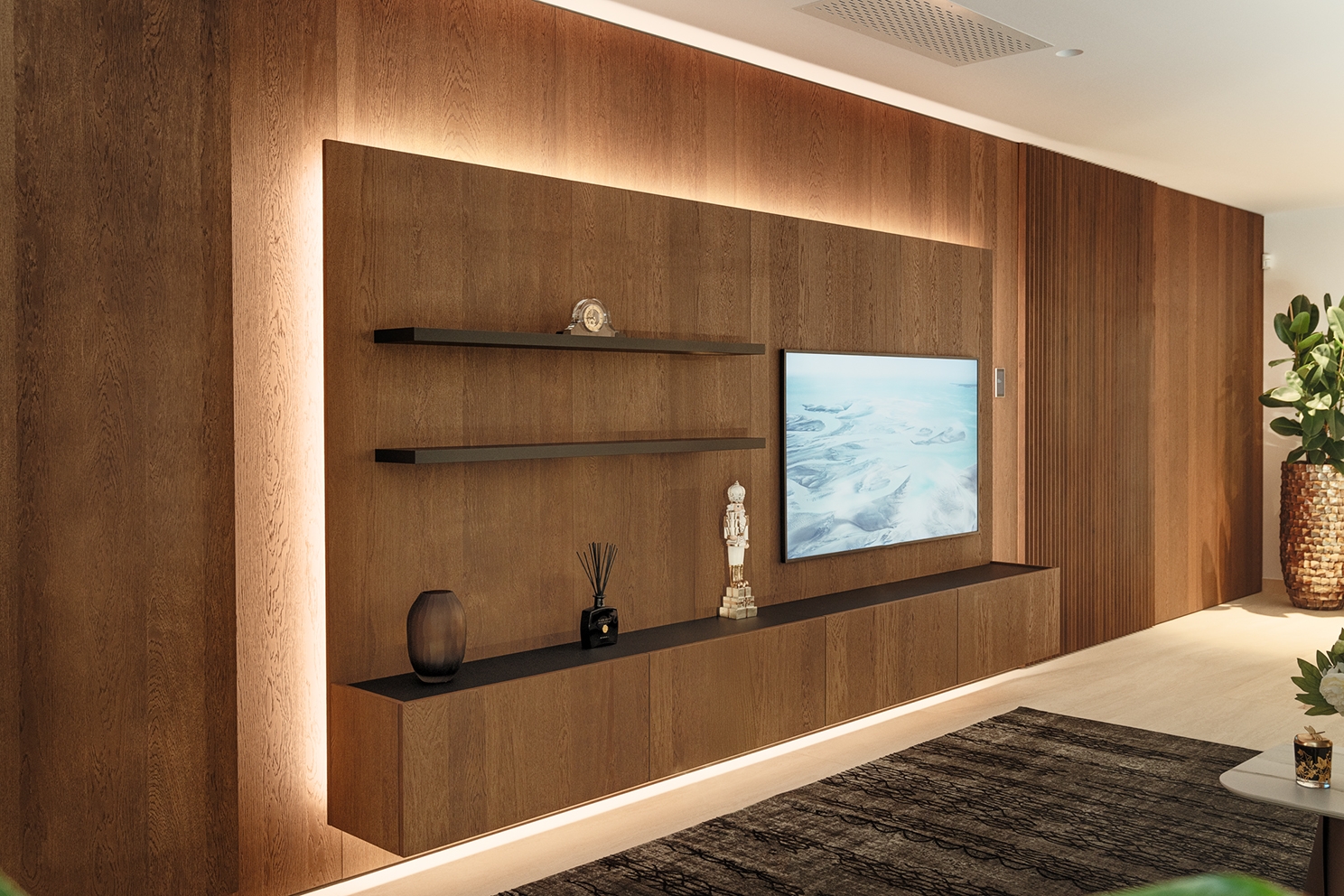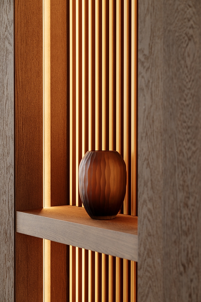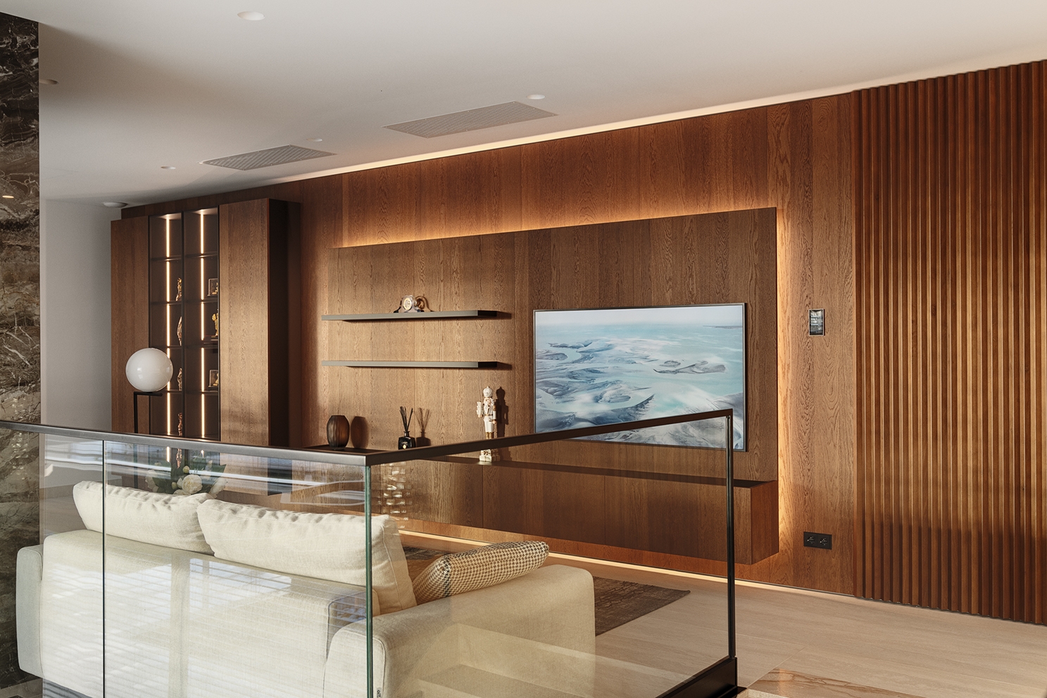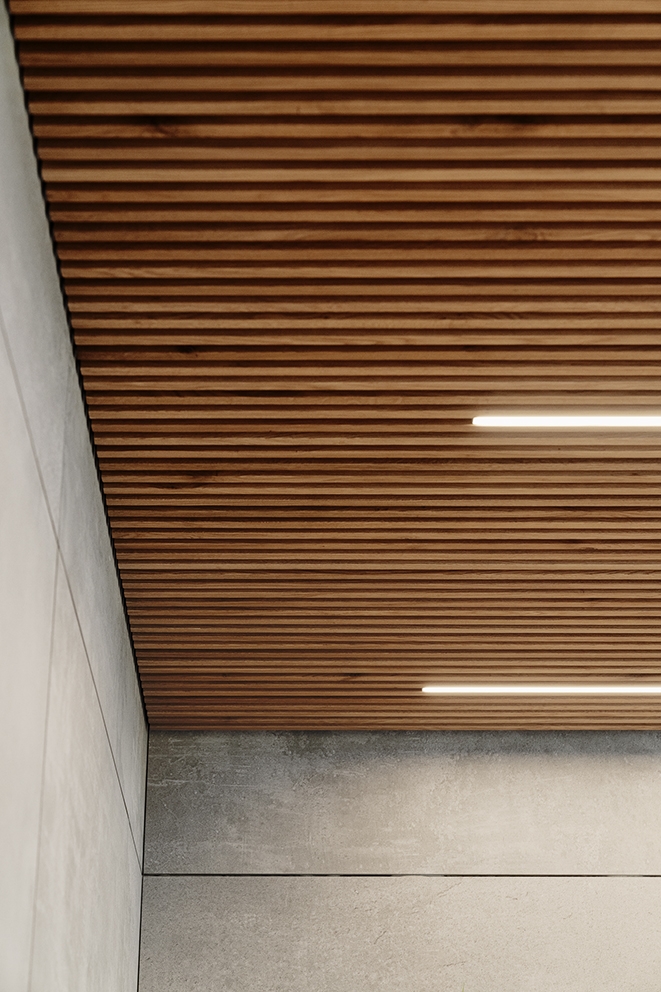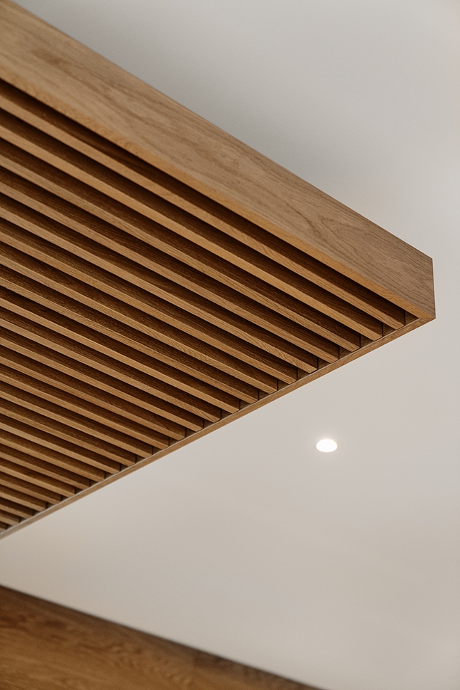 W ramach realizacji dostarczyliśmy zabudowę kuchenną, regały o zróżnicowanej funkcji, panele ścienne, barek w strefie wellness oraz szczeblowane fragmenty sufitów, które poprawiają jej akustykę. To projekt, który przypomina, że luksus tkwi w przestrzeni i detalu.