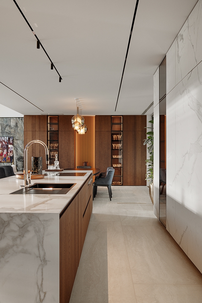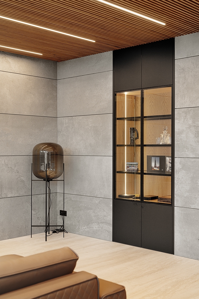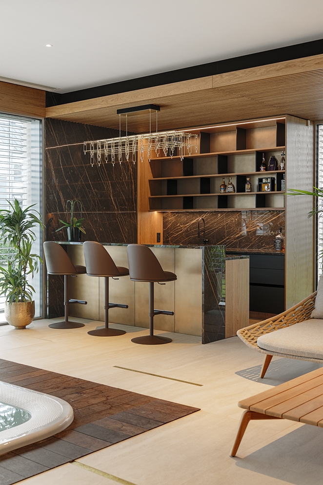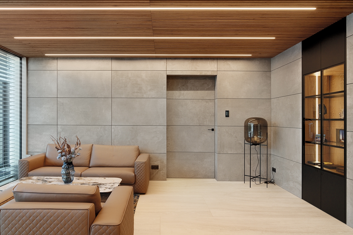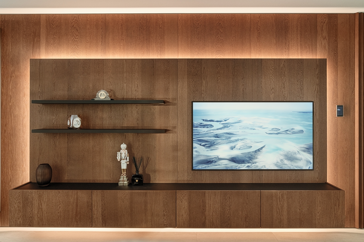 W ramach realizacji dostarczyliśmy zabudowę kuchenną, regały o zróżnicowanej funkcji, panele ścienne, barek w strefie wellness oraz szczeblowane fragmenty sufitów, które poprawiają jej akustykę. To projekt, który przypomina, że luksus tkwi w przestrzeni i detalu.