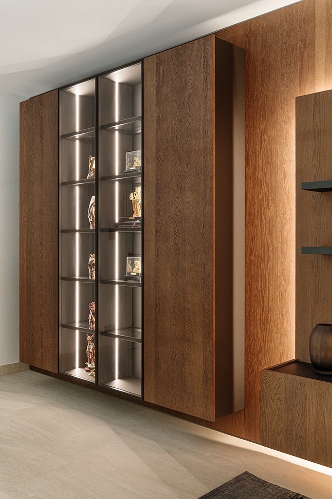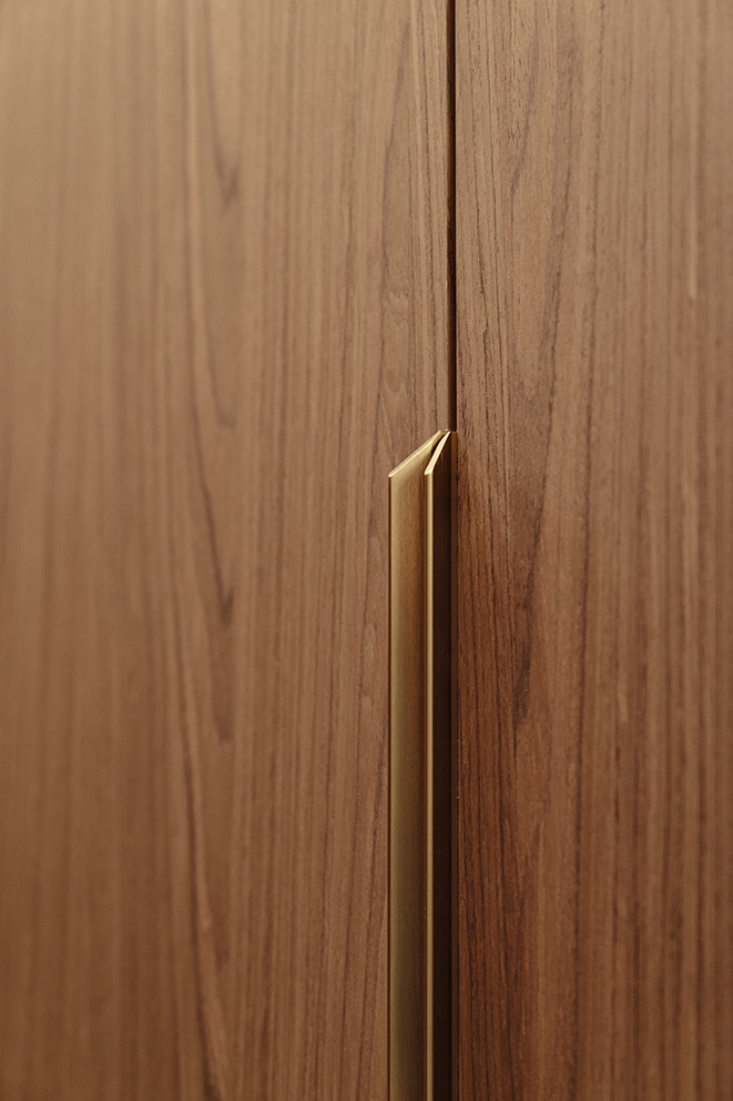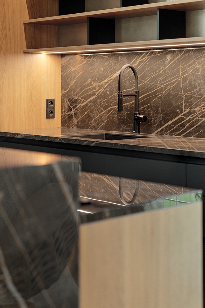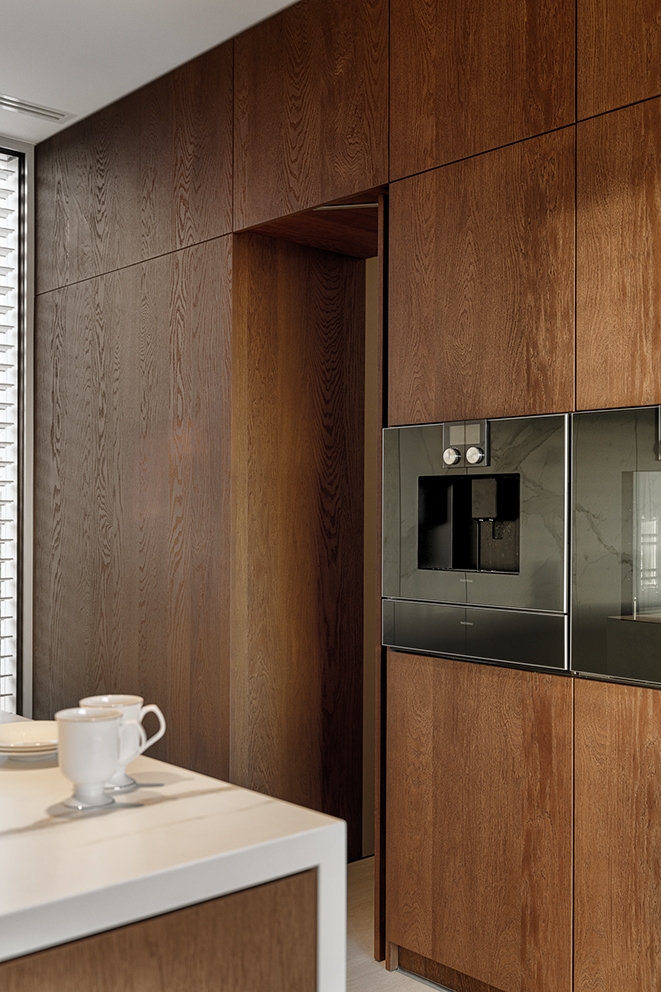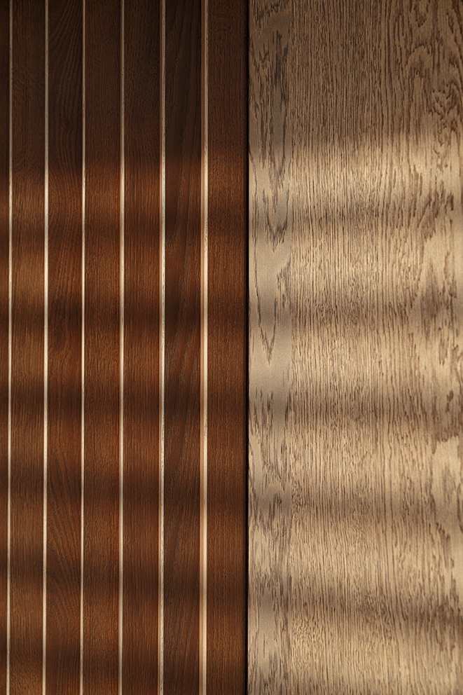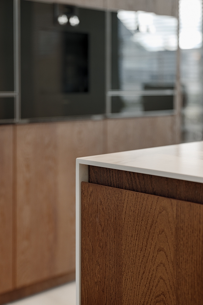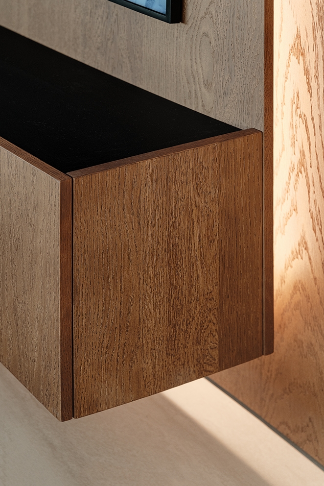 We wnętrzu konsekwentnie pojawia się fornir dębowy, którego ponadczasowa elegancja ociepla aranżację i spina ją estetyczną klamrą.