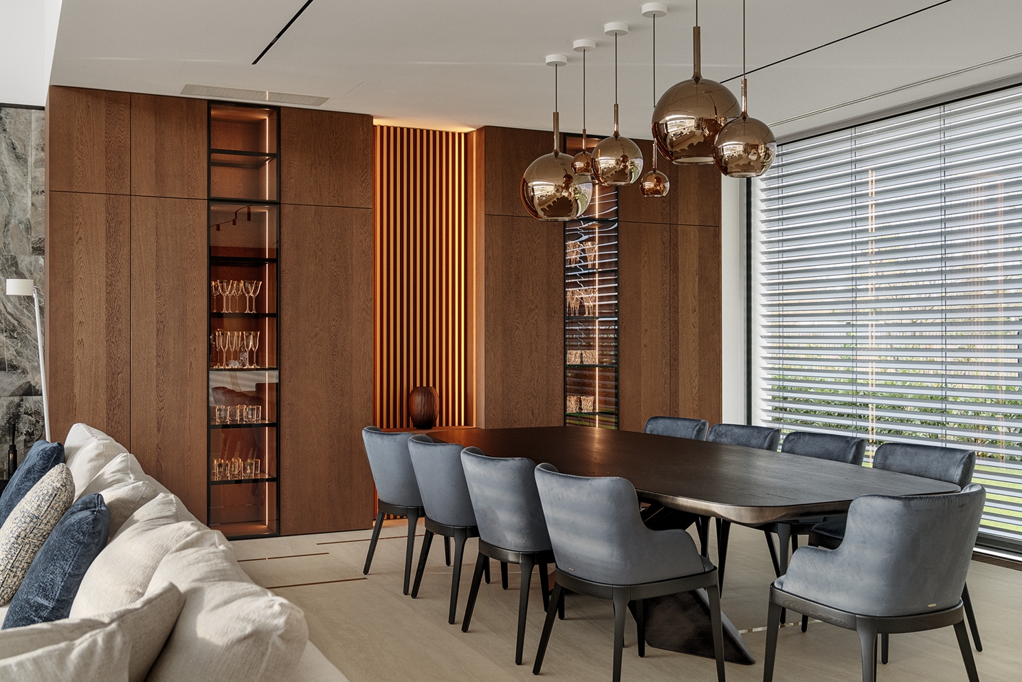 Rozległa przestrzeń reprezentacyjna sprzyja zarówno codziennemu życiu domowników, jak i spotkaniom towarzyskim. Jej część stanowią antresola ze ścianą telewizyjną, jadalnia oraz otwarta kuchnia, w której wysoka zabudowa skrywa przejście do kuchni technicznej przystosowanej do intensywnego gotowania.